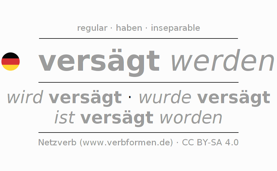 Tablas de verbos para la conjugación de versägt werden en línea, representadas de forma simple, con todas las construcciones verbales en singular y plural, en todas las personas gramaticales (1ª persona, 2ª persona, 3ª persona). El practicar la conjugación del verbo versägt werden es útil para tareas, exámenes, la escuela, la universidad, las clases de alemán y para los estudiantes adultos. Especialmente para los estudiantes del alemán es muy importante el conjugar los verbos y el formar las raíces verbales de forma correcta. Aquí encuentras más información acerca del tema Wiktionary versägen und unter versägen im Duden.
