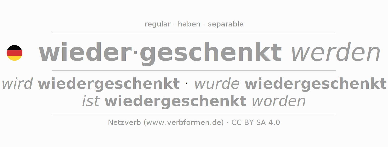 | ich | werde wiedergeschenkt | wurde wiedergeschenkt | werde wiedergeschenkt | würde wiedergeschenkt | - |