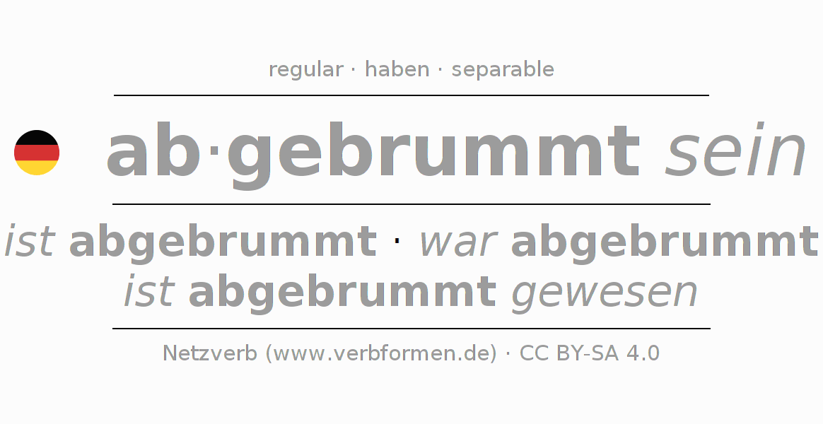Tablas de verbos para la conjugación de ab·gebrummt sein en línea, representadas de forma simple, con todas las construcciones verbales en singular y plural, en todas las personas gramaticales (1ª persona, 2ª persona, 3ª persona). El practicar la conjugación del verbo ab·gebrummt sein es útil para tareas, exámenes, la escuela, la universidad, las clases de alemán y para los estudiantes adultos. Especialmente para los estudiantes del alemán es muy importante el conjugar los verbos y el formar las raíces verbales de forma correcta. Aquí encuentras más información acerca del tema Wiktionary abbrummen und unter abbrummen im Duden.