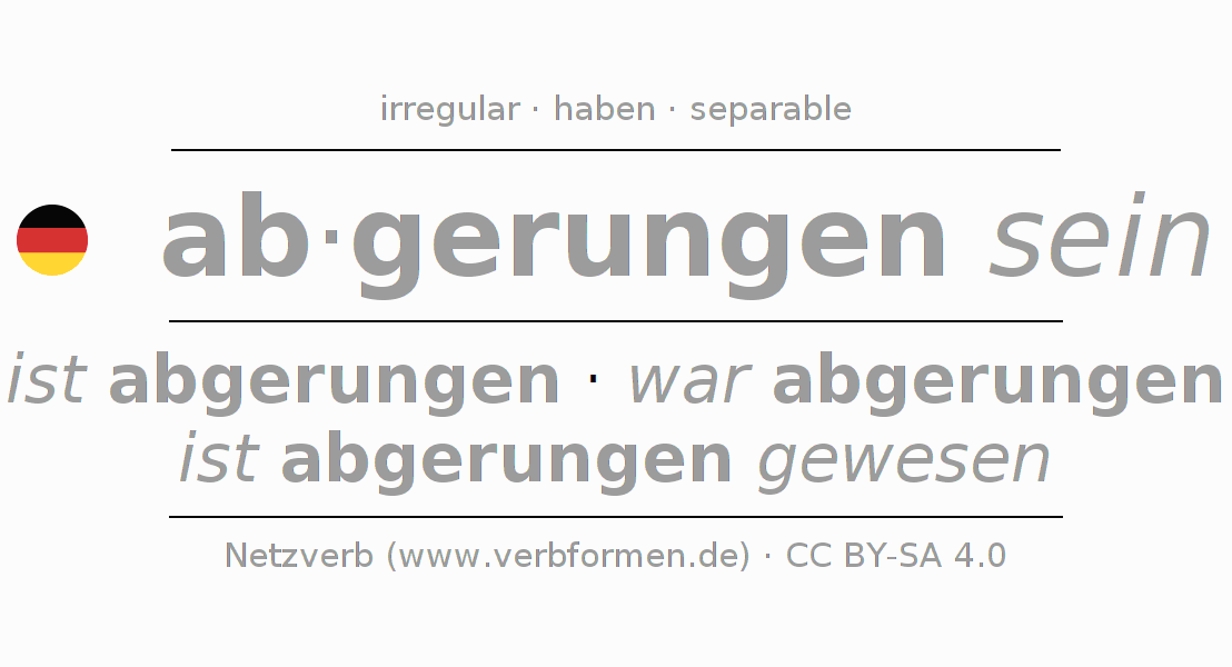 Tablas de verbos para la conjugación de ab·gerungen sein en línea, representadas de forma simple, con todas las construcciones verbales en singular y plural, en todas las personas gramaticales (1ª persona, 2ª persona, 3ª persona). El practicar la conjugación del verbo ab·gerungen sein es útil para tareas, exámenes, la escuela, la universidad, las clases de alemán y para los estudiantes adultos. Especialmente para los estudiantes del alemán es muy importante el conjugar los verbos y el formar las raíces verbales de forma correcta. Aquí encuentras más información acerca del tema Wiktionary abringen und unter abringen im Duden.