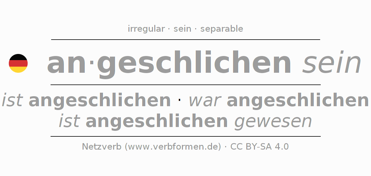 Tablas de verbos para la conjugación de an·geschlichen sein en línea, representadas de forma simple, con todas las construcciones verbales en singular y plural, en todas las personas gramaticales (1ª persona, 2ª persona, 3ª persona). El practicar la conjugación del verbo an·geschlichen sein es útil para tareas, exámenes, la escuela, la universidad, las clases de alemán y para los estudiantes adultos. Especialmente para los estudiantes del alemán es muy importante el conjugar los verbos y el formar las raíces verbales de forma correcta. Aquí encuentras más información acerca del tema Wiktionary anschleichen und unter anschleichen im Duden.