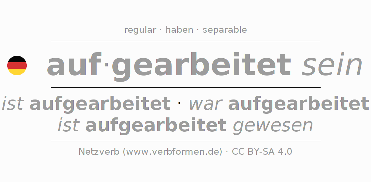 Tablas de verbos para la conjugación de auf·gearbeitet sein en línea, representadas de forma simple, con todas las construcciones verbales en singular y plural, en todas las personas gramaticales (1ª persona, 2ª persona, 3ª persona). El practicar la conjugación del verbo auf·gearbeitet sein es útil para tareas, exámenes, la escuela, la universidad, las clases de alemán y para los estudiantes adultos. Especialmente para los estudiantes del alemán es muy importante el conjugar los verbos y el formar las raíces verbales de forma correcta. Aquí encuentras más información acerca del tema Wiktionary aufarbeiten und unter aufarbeiten im Duden.