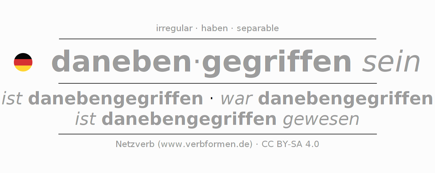 - Pasado perfecto: ich bin danebengegriffen gewesen, du bist danebengegriffen gewesen, er ist danebengegriffen gewesen, wir sind danebengegriffen gewesen, ihr seid danebengegriffen gewesen, sie sind danebengegriffen gewesen