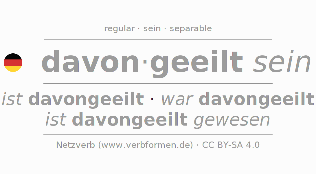 Tablas de verbos para la conjugación de davon·geeilt sein en línea, representadas de forma simple, con todas las construcciones verbales en singular y plural, en todas las personas gramaticales (1ª persona, 2ª persona, 3ª persona). El practicar la conjugación del verbo davon·geeilt sein es útil para tareas, exámenes, la escuela, la universidad, las clases de alemán y para los estudiantes adultos. Especialmente para los estudiantes del alemán es muy importante el conjugar los verbos y el formar las raíces verbales de forma correcta. Aquí encuentras más información acerca del tema Wiktionary davoneilen und unter davoneilen im Duden.