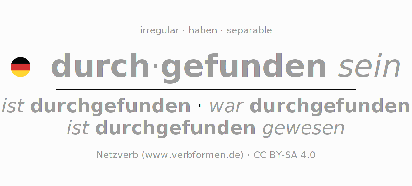 - Pasado perfecto: ich bin durchgefunden gewesen, du bist durchgefunden gewesen, er ist durchgefunden gewesen, wir sind durchgefunden gewesen, ihr seid durchgefunden gewesen, sie sind durchgefunden gewesen