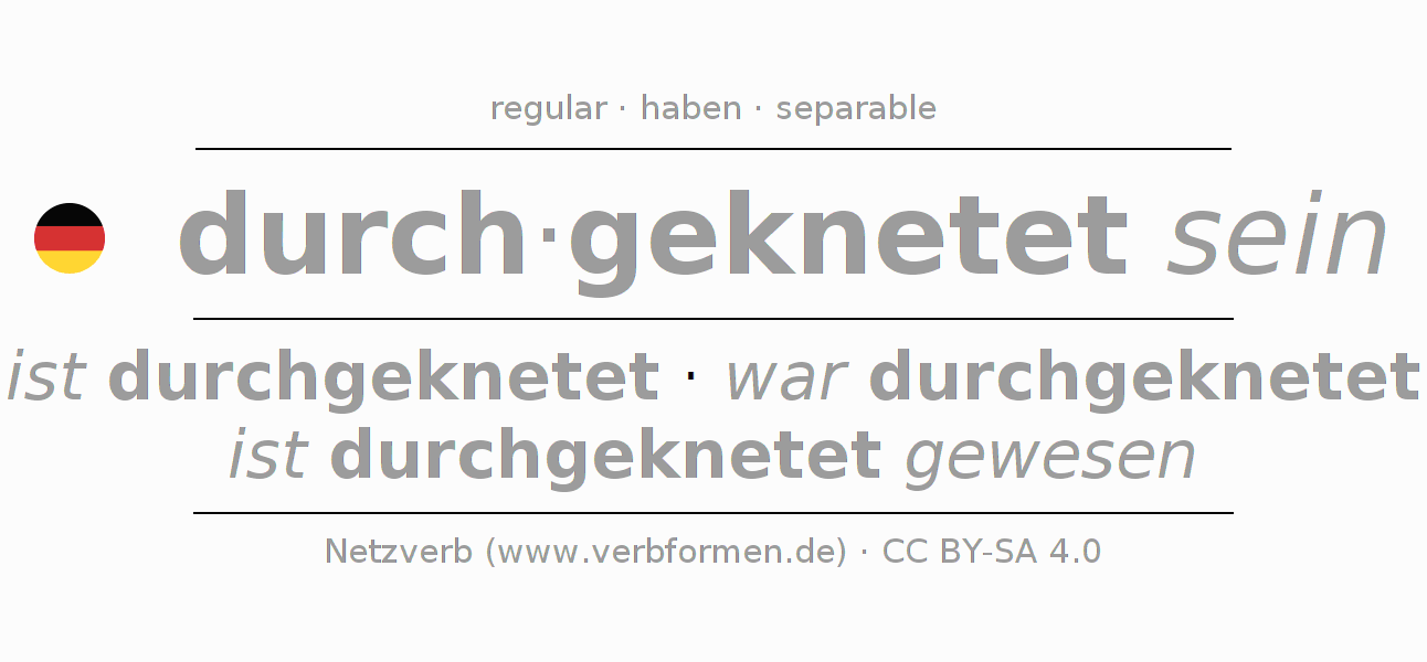 - Pasado perfecto: ich bin durchgeknetet gewesen, du bist durchgeknetet gewesen, er ist durchgeknetet gewesen, wir sind durchgeknetet gewesen, ihr seid durchgeknetet gewesen, sie sind durchgeknetet gewesen