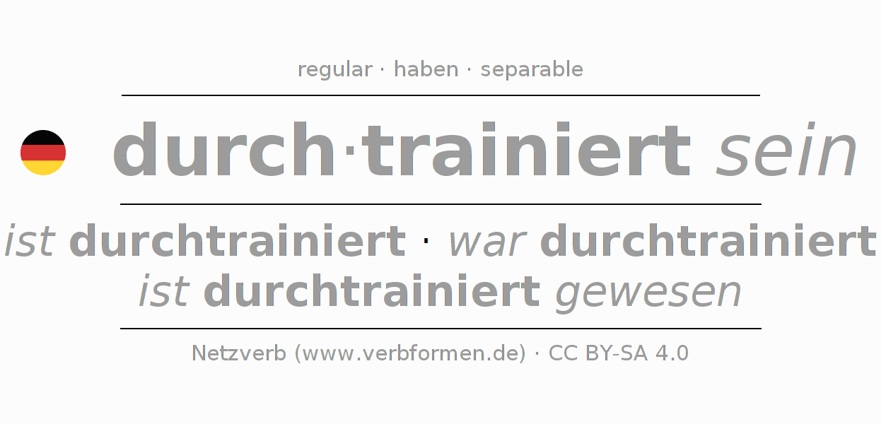 - Pasado perfecto: ich bin durchtrainiert gewesen, du bist durchtrainiert gewesen, er ist durchtrainiert gewesen, wir sind durchtrainiert gewesen, ihr seid durchtrainiert gewesen, sie sind durchtrainiert gewesen