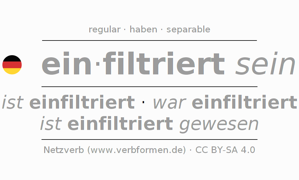 Tablas de verbos para la conjugación de ein·filtriert sein en línea, representadas de forma simple, con todas las construcciones verbales en singular y plural, en todas las personas gramaticales (1ª persona, 2ª persona, 3ª persona). El practicar la conjugación del verbo ein·filtriert sein es útil para tareas, exámenes, la escuela, la universidad, las clases de alemán y para los estudiantes adultos. Especialmente para los estudiantes del alemán es muy importante el conjugar los verbos y el formar las raíces verbales de forma correcta. Aquí encuentras más información acerca del tema Wiktionary einfiltrieren und unter einfiltrieren im Duden.