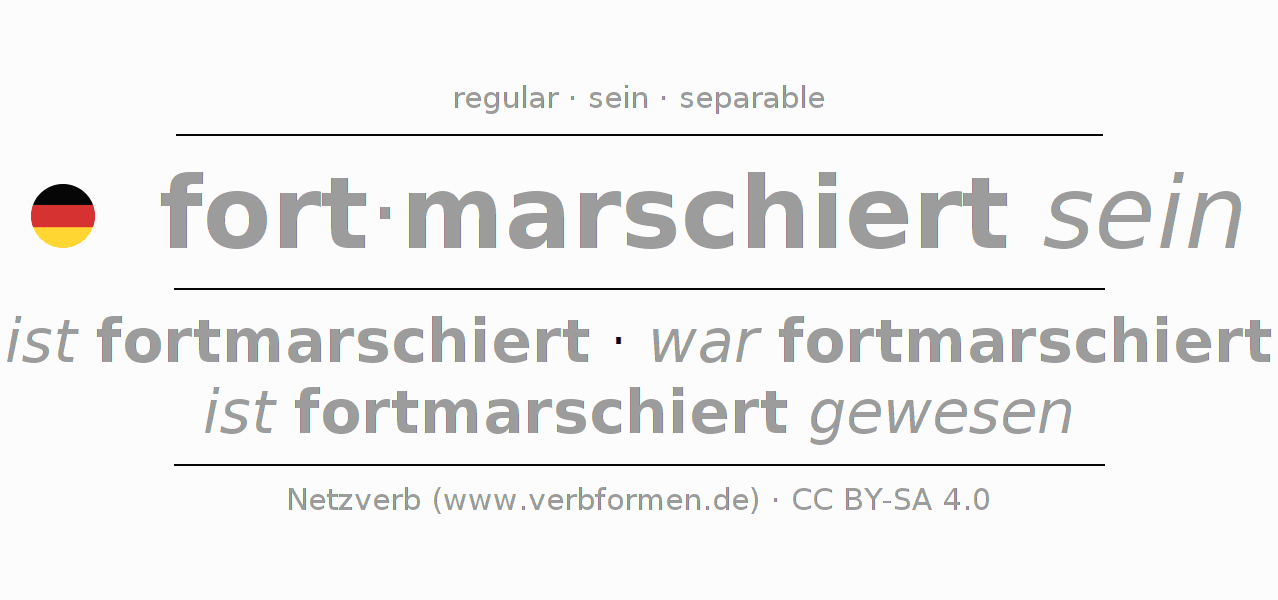Tablas de verbos para la conjugación de fort·marschiert sein en línea, representadas de forma simple, con todas las construcciones verbales en singular y plural, en todas las personas gramaticales (1ª persona, 2ª persona, 3ª persona). El practicar la conjugación del verbo fort·marschiert sein es útil para tareas, exámenes, la escuela, la universidad, las clases de alemán y para los estudiantes adultos. Especialmente para los estudiantes del alemán es muy importante el conjugar los verbos y el formar las raíces verbales de forma correcta. Aquí encuentras más información acerca del tema Wiktionary fortmarschieren und unter fortmarschieren im Duden.