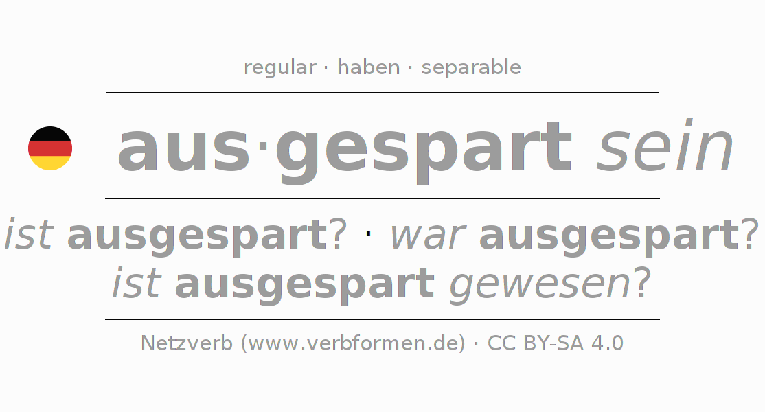 Tablas de verbos para la conjugación de aus·gespart sein en línea, representadas de forma simple, con todas las construcciones verbales en singular y plural, en todas las personas gramaticales (1ª persona, 2ª persona, 3ª persona). El practicar la conjugación del verbo aus·gespart sein es útil para tareas, exámenes, la escuela, la universidad, las clases de alemán y para los estudiantes adultos. Especialmente para los estudiantes del alemán es muy importante el conjugar los verbos y el formar las raíces verbales de forma correcta. Aquí encuentras más información acerca del tema Wiktionary aussparen und unter aussparen im Duden.