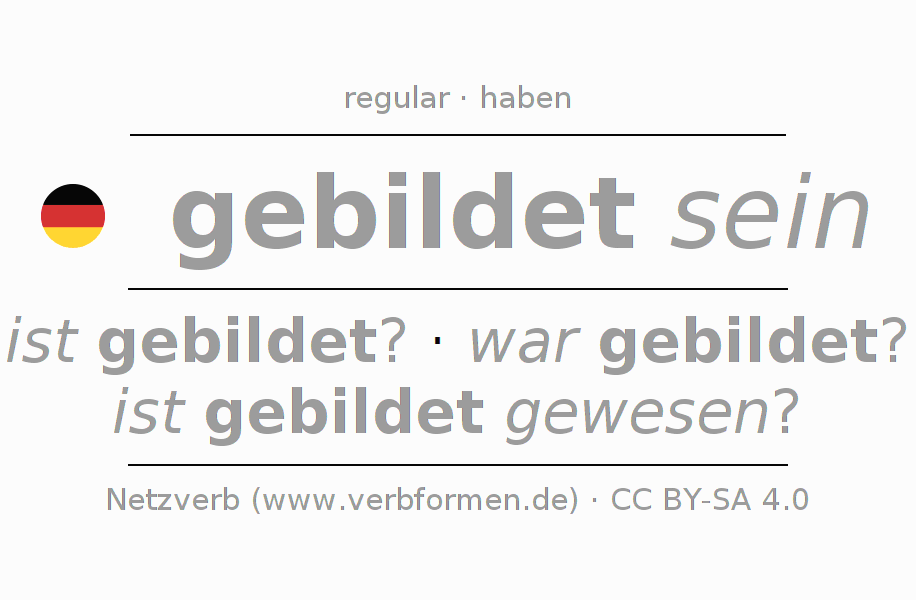 Tablas de verbos para la conjugación de gebildet sein en línea, representadas de forma simple, con todas las construcciones verbales en singular y plural, en todas las personas gramaticales (1ª persona, 2ª persona, 3ª persona). El practicar la conjugación del verbo gebildet sein es útil para tareas, exámenes, la escuela, la universidad, las clases de alemán y para los estudiantes adultos. Especialmente para los estudiantes del alemán es muy importante el conjugar los verbos y el formar las raíces verbales de forma correcta. Aquí encuentras más información acerca del tema Wiktionary bilden und unter bilden im Duden.