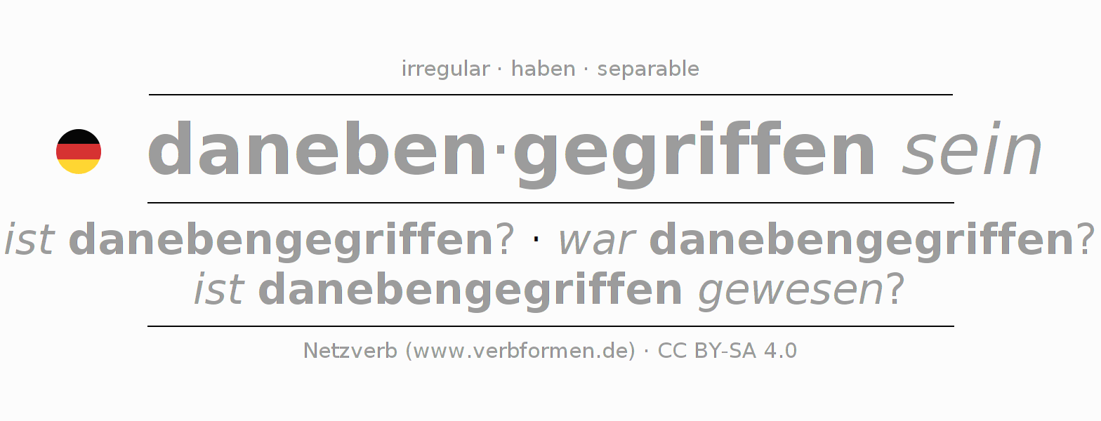 - Pasado perfecto: bin ich danebengegriffen gewesen?, bist du danebengegriffen gewesen?, ist er danebengegriffen gewesen?, sind wir danebengegriffen gewesen?, seid ihr danebengegriffen gewesen?, sind sie danebengegriffen gewesen?