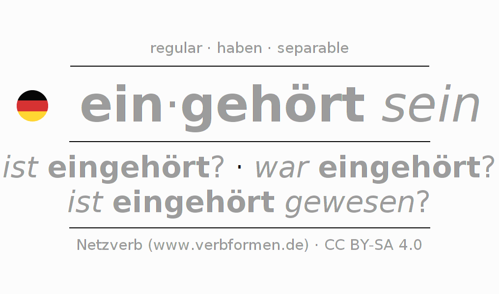 - Pasado perfecto: sei ich eingehört gewesen?, seiest du eingehört gewesen?, sei er eingehört gewesen?, seien wir eingehört gewesen?, seiet ihr eingehört gewesen?, seien sie eingehört gewesen?