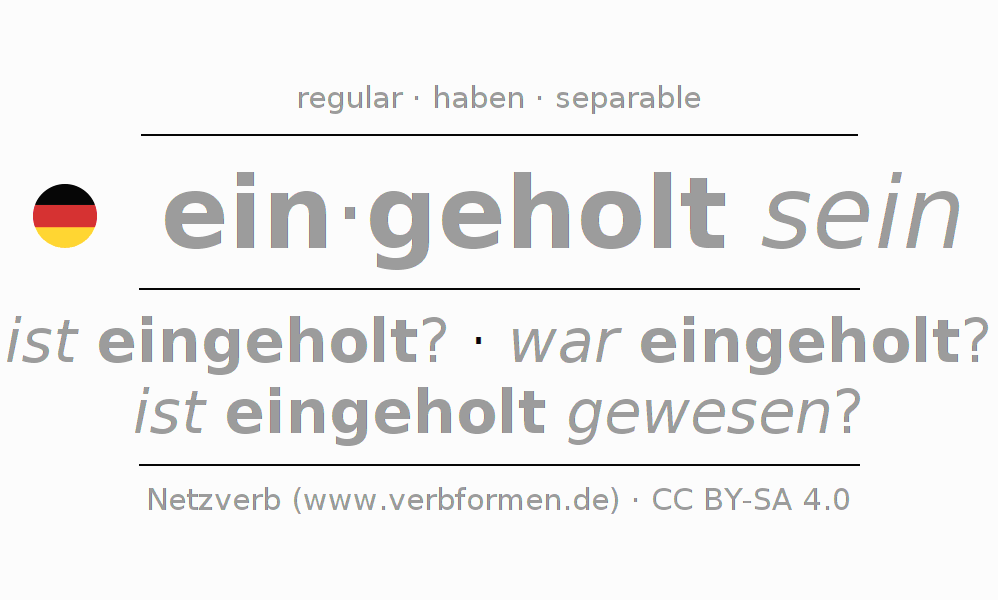 Tablas de verbos para la conjugación de ein·geholt sein en línea, representadas de forma simple, con todas las construcciones verbales en singular y plural, en todas las personas gramaticales (1ª persona, 2ª persona, 3ª persona). El practicar la conjugación del verbo ein·geholt sein es útil para tareas, exámenes, la escuela, la universidad, las clases de alemán y para los estudiantes adultos. Especialmente para los estudiantes del alemán es muy importante el conjugar los verbos y el formar las raíces verbales de forma correcta. Aquí encuentras más información acerca del tema Wiktionary einholen und unter einholen im Duden.