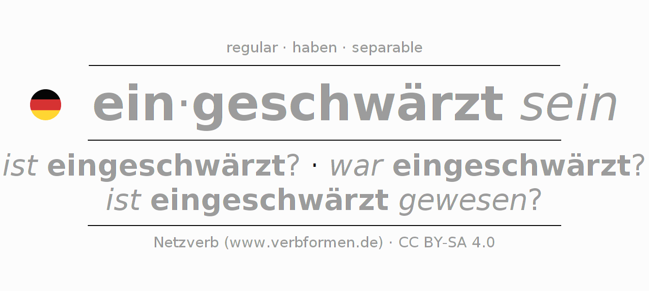 Tablas de verbos para la conjugación de ein·geschwärzt sein en línea, representadas de forma simple, con todas las construcciones verbales en singular y plural, en todas las personas gramaticales (1ª persona, 2ª persona, 3ª persona). El practicar la conjugación del verbo ein·geschwärzt sein es útil para tareas, exámenes, la escuela, la universidad, las clases de alemán y para los estudiantes adultos. Especialmente para los estudiantes del alemán es muy importante el conjugar los verbos y el formar las raíces verbales de forma correcta. Aquí encuentras más información acerca del tema Wiktionary einschwärzen und unter einschwärzen im Duden.