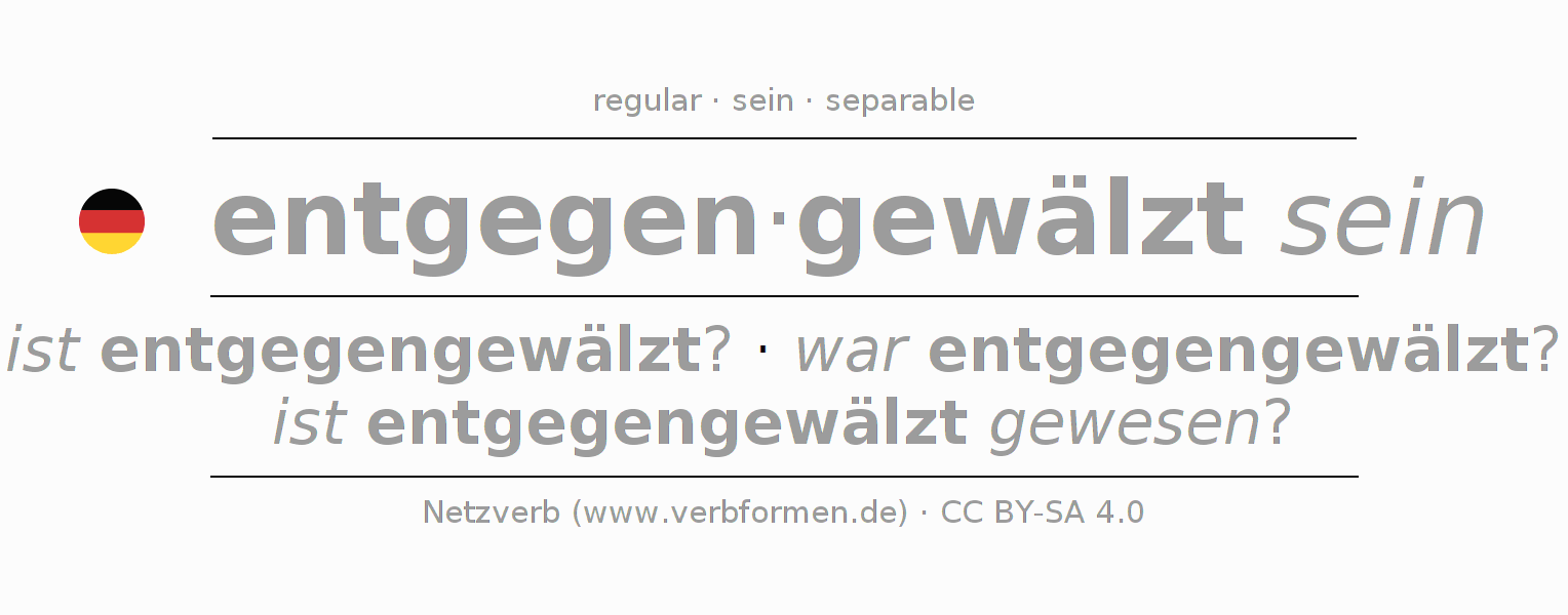 - Futuro I: werde ich entgegengewälzt sein?, werdest du entgegengewälzt sein?, werde er entgegengewälzt sein?, werden wir entgegengewälzt sein?, werdet ihr entgegengewälzt sein?, werden sie entgegengewälzt sein?