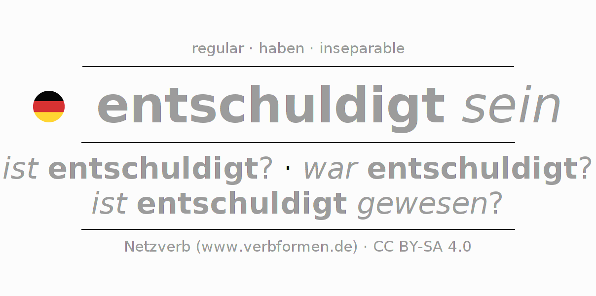 Tablas de verbos para la conjugación de entschuldigt sein en línea, representadas de forma simple, con todas las construcciones verbales en singular y plural, en todas las personas gramaticales (1ª persona, 2ª persona, 3ª persona). El practicar la conjugación del verbo entschuldigt sein es útil para tareas, exámenes, la escuela, la universidad, las clases de alemán y para los estudiantes adultos. Especialmente para los estudiantes del alemán es muy importante el conjugar los verbos y el formar las raíces verbales de forma correcta. Aquí encuentras más información acerca del tema Wiktionary entschuldigen und unter entschuldigen im Duden.
