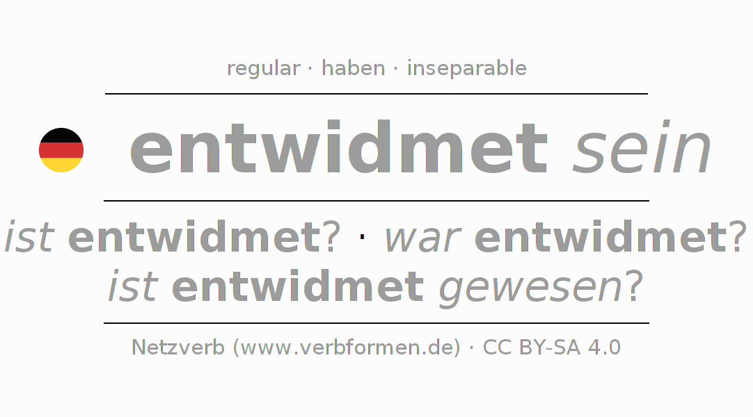 Tablas de verbos para la conjugación de entwidmet sein en línea, representadas de forma simple, con todas las construcciones verbales en singular y plural, en todas las personas gramaticales (1ª persona, 2ª persona, 3ª persona). El practicar la conjugación del verbo entwidmet sein es útil para tareas, exámenes, la escuela, la universidad, las clases de alemán y para los estudiantes adultos. Especialmente para los estudiantes del alemán es muy importante el conjugar los verbos y el formar las raíces verbales de forma correcta. Aquí encuentras más información acerca del tema Wiktionary entwidmen und unter entwidmen im Duden.