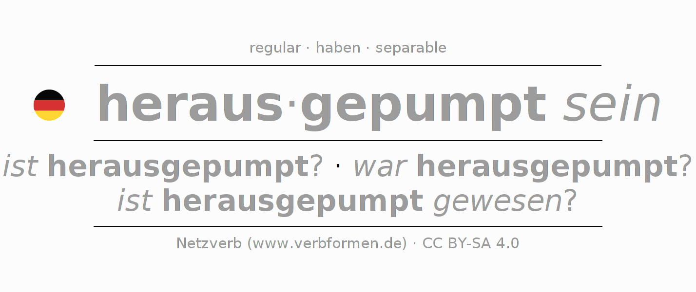 Tablas de verbos para la conjugación de heraus·gepumpt sein en línea, representadas de forma simple, con todas las construcciones verbales en singular y plural, en todas las personas gramaticales (1ª persona, 2ª persona, 3ª persona). El practicar la conjugación del verbo heraus·gepumpt sein es útil para tareas, exámenes, la escuela, la universidad, las clases de alemán y para los estudiantes adultos. Especialmente para los estudiantes del alemán es muy importante el conjugar los verbos y el formar las raíces verbales de forma correcta. Aquí encuentras más información acerca del tema Wiktionary herauspumpen und unter herauspumpen im Duden.