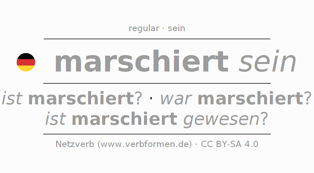 Tablas de verbos para la conjugación de marschiert sein en línea, representadas de forma simple, con todas las construcciones verbales en singular y plural, en todas las personas gramaticales (1ª persona, 2ª persona, 3ª persona). El practicar la conjugación del verbo marschiert sein es útil para tareas, exámenes, la escuela, la universidad, las clases de alemán y para los estudiantes adultos. Especialmente para los estudiantes del alemán es muy importante el conjugar los verbos y el formar las raíces verbales de forma correcta. Aquí encuentras más información acerca del tema Wiktionary marschieren und unter marschieren im Duden.