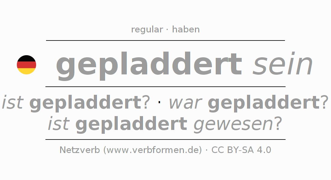 Tablas de verbos para la conjugación de gepladdert sein en línea, representadas de forma simple, con todas las construcciones verbales en singular y plural, en todas las personas gramaticales (1ª persona, 2ª persona, 3ª persona). El practicar la conjugación del verbo gepladdert sein es útil para tareas, exámenes, la escuela, la universidad, las clases de alemán y para los estudiantes adultos. Especialmente para los estudiantes del alemán es muy importante el conjugar los verbos y el formar las raíces verbales de forma correcta. Aquí encuentras más información acerca del tema Wiktionary pladdern und unter pladdern im Duden.