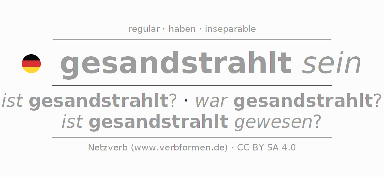 - Pasado perfecto: bin ich gesandstrahlt gewesen?, bist du gesandstrahlt gewesen?, ist er gesandstrahlt gewesen?, sind wir gesandstrahlt gewesen?, seid ihr gesandstrahlt gewesen?, sind sie gesandstrahlt gewesen?