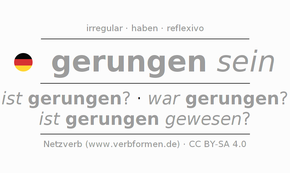 Tablas de verbos para la conjugación de gerungen sein en línea, representadas de forma simple, con todas las construcciones verbales en singular y plural, en todas las personas gramaticales (1ª persona, 2ª persona, 3ª persona). El practicar la conjugación del verbo gerungen sein es útil para tareas, exámenes, la escuela, la universidad, las clases de alemán y para los estudiantes adultos. Especialmente para los estudiantes del alemán es muy importante el conjugar los verbos y el formar las raíces verbales de forma correcta. Aquí encuentras más información acerca del tema Wiktionary ringen und unter ringen im Duden.