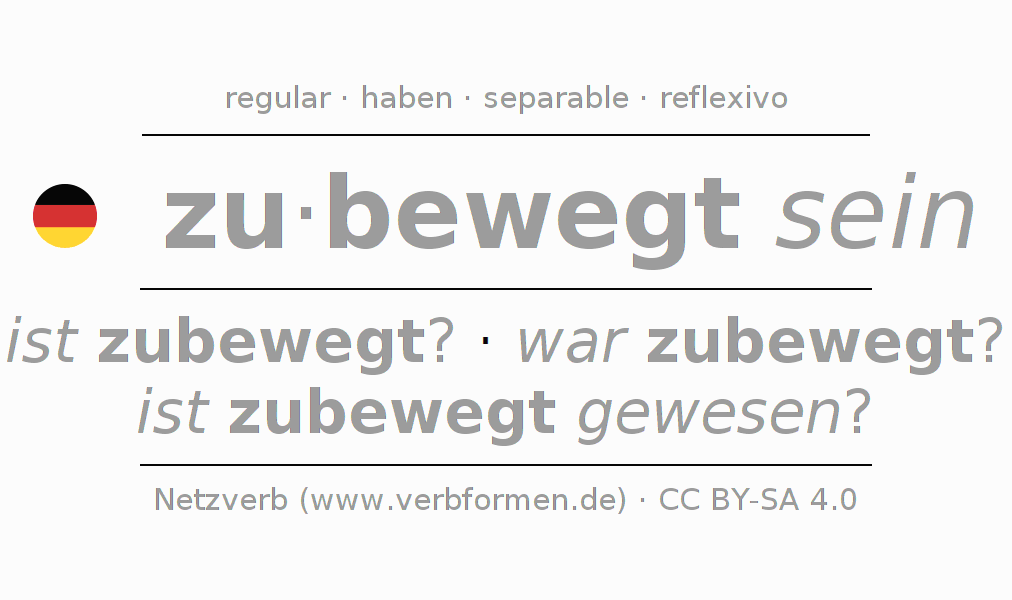 - Pasado perfecto: bin ich zubewegt gewesen?, bist du zubewegt gewesen?, ist er zubewegt gewesen?, sind wir zubewegt gewesen?, seid ihr zubewegt gewesen?, sind sie zubewegt gewesen?