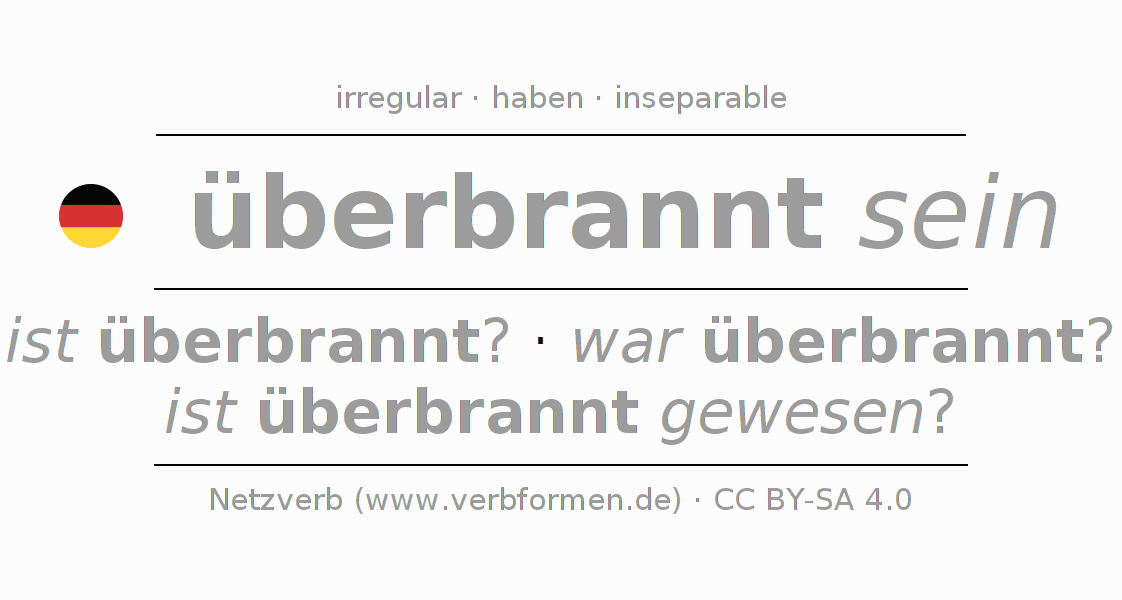 - Pretérito: war ich überbrannt?, warst du überbrannt?, war er überbrannt?, waren wir überbrannt?, wart ihr überbrannt?, waren sie überbrannt?