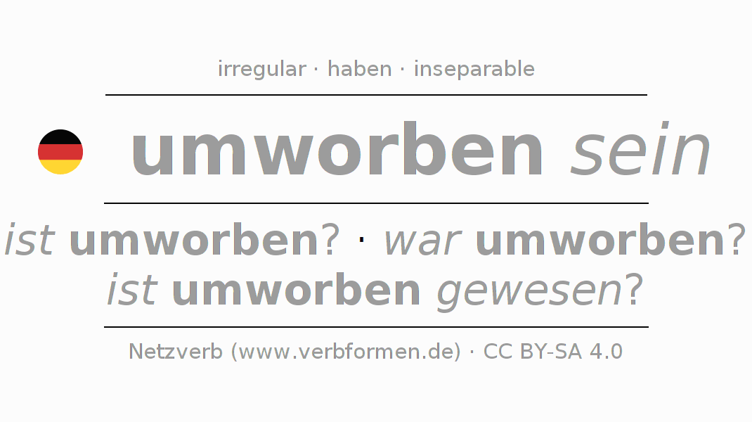 - Pasado perfecto: bin ich umworben gewesen?, bist du umworben gewesen?, ist er umworben gewesen?, sind wir umworben gewesen?, seid ihr umworben gewesen?, sind sie umworben gewesen?