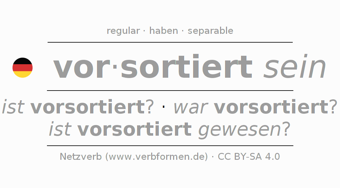 Tablas de verbos para la conjugación de vor·sortiert sein en línea, representadas de forma simple, con todas las construcciones verbales en singular y plural, en todas las personas gramaticales (1ª persona, 2ª persona, 3ª persona). El practicar la conjugación del verbo vor·sortiert sein es útil para tareas, exámenes, la escuela, la universidad, las clases de alemán y para los estudiantes adultos. Especialmente para los estudiantes del alemán es muy importante el conjugar los verbos y el formar las raíces verbales de forma correcta. Aquí encuentras más información acerca del tema Wiktionary vorsortieren und unter vorsortieren im Duden.