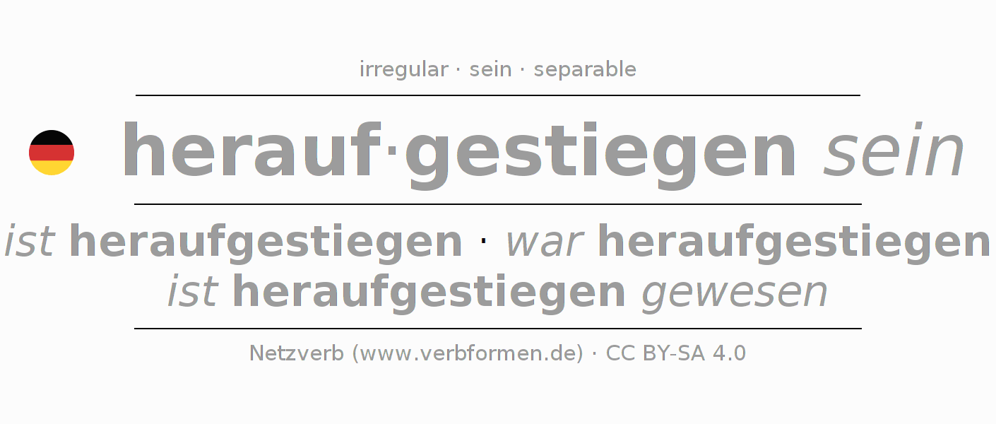- Pasado perfecto: ich bin heraufgestiegen gewesen, du bist heraufgestiegen gewesen, er ist heraufgestiegen gewesen, wir sind heraufgestiegen gewesen, ihr seid heraufgestiegen gewesen, sie sind heraufgestiegen gewesen