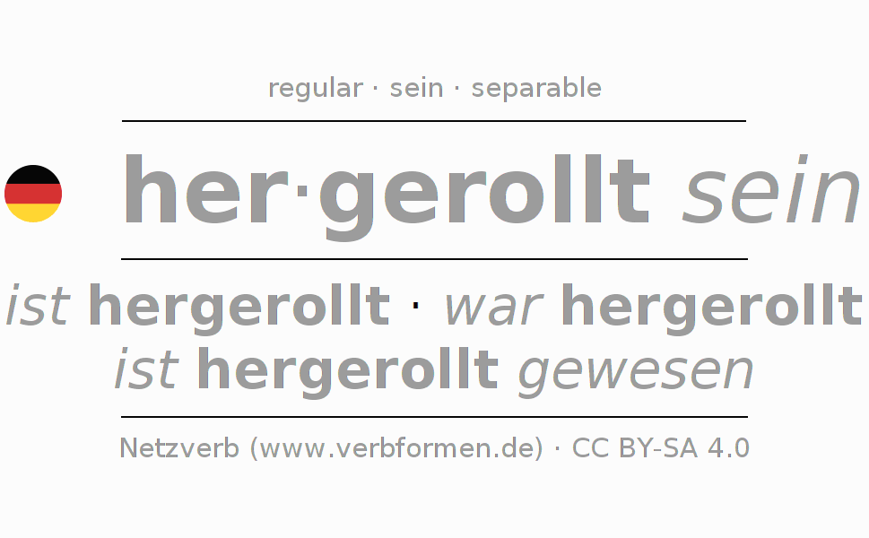 Tablas de verbos para la conjugación de her·gerollt sein en línea, representadas de forma simple, con todas las construcciones verbales en singular y plural, en todas las personas gramaticales (1ª persona, 2ª persona, 3ª persona). El practicar la conjugación del verbo her·gerollt sein es útil para tareas, exámenes, la escuela, la universidad, las clases de alemán y para los estudiantes adultos. Especialmente para los estudiantes del alemán es muy importante el conjugar los verbos y el formar las raíces verbales de forma correcta. Aquí encuentras más información acerca del tema Wiktionary herrollen und unter herrollen im Duden.