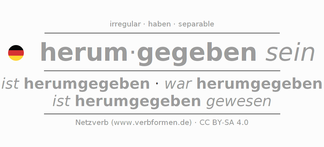 - Pasado perfecto: ich bin herumgegeben gewesen, du bist herumgegeben gewesen, er ist herumgegeben gewesen, wir sind herumgegeben gewesen, ihr seid herumgegeben gewesen, sie sind herumgegeben gewesen