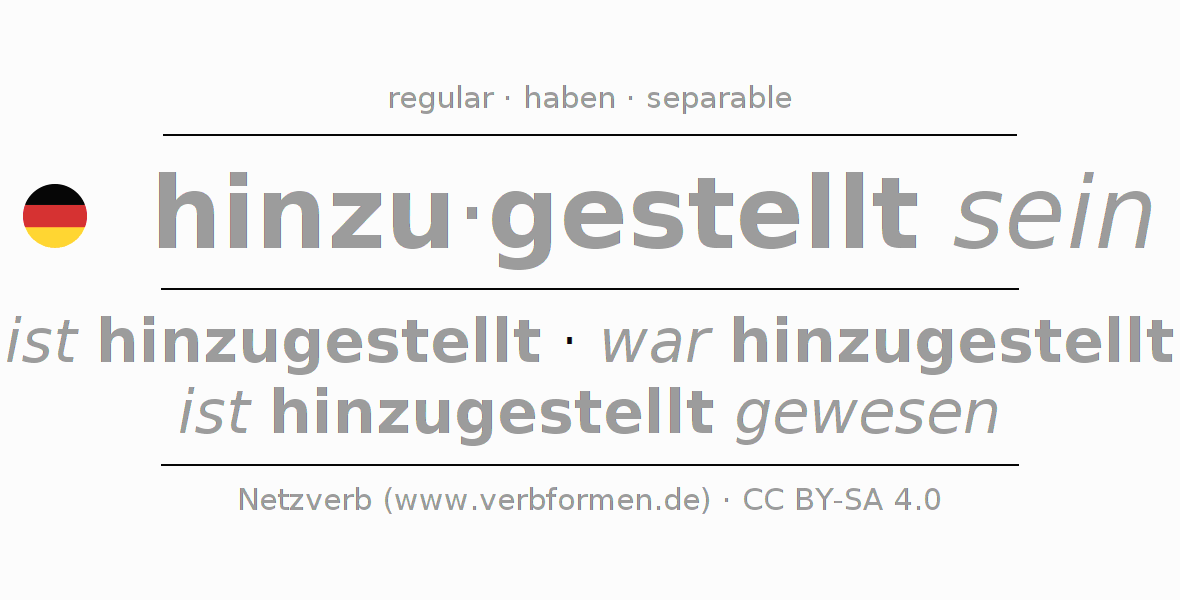 Tablas de verbos para la conjugación de hinzu·gestellt sein en línea, representadas de forma simple, con todas las construcciones verbales en singular y plural, en todas las personas gramaticales (1ª persona, 2ª persona, 3ª persona). El practicar la conjugación del verbo hinzu·gestellt sein es útil para tareas, exámenes, la escuela, la universidad, las clases de alemán y para los estudiantes adultos. Especialmente para los estudiantes del alemán es muy importante el conjugar los verbos y el formar las raíces verbales de forma correcta. Aquí encuentras más información acerca del tema Wiktionary hinzustellen und unter hinzustellen im Duden.