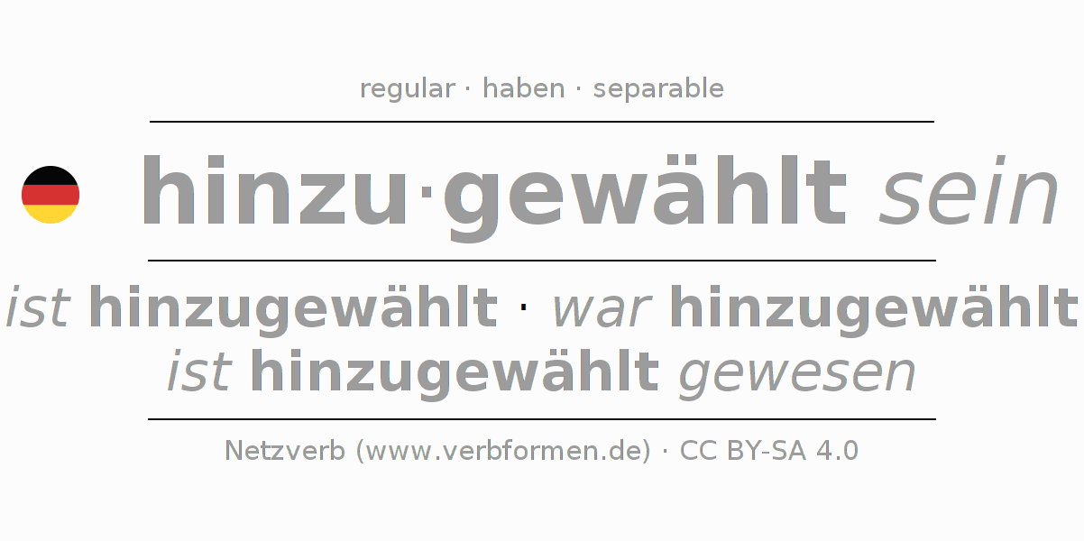 - Presente: ich bin hinzugewählt, du bist hinzugewählt, er ist hinzugewählt, wir sind hinzugewählt, ihr seid hinzugewählt, sie sind hinzugewählt