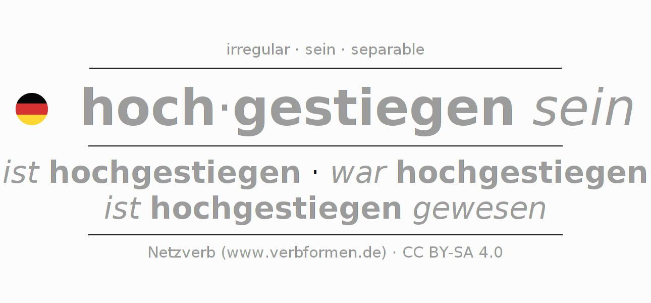 - Pasado perfecto: ich bin hochgestiegen gewesen, du bist hochgestiegen gewesen, er ist hochgestiegen gewesen, wir sind hochgestiegen gewesen, ihr seid hochgestiegen gewesen, sie sind hochgestiegen gewesen