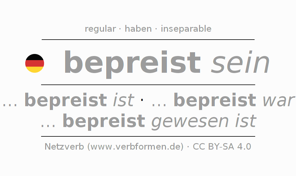 - Futuro II: ... ich bepreist gewesen sein werde, ... du bepreist gewesen sein wirst, ... er bepreist gewesen sein wird, ... wir bepreist gewesen sein werden, ... ihr bepreist gewesen sein werdet, ... sie bepreist gewesen sein werden