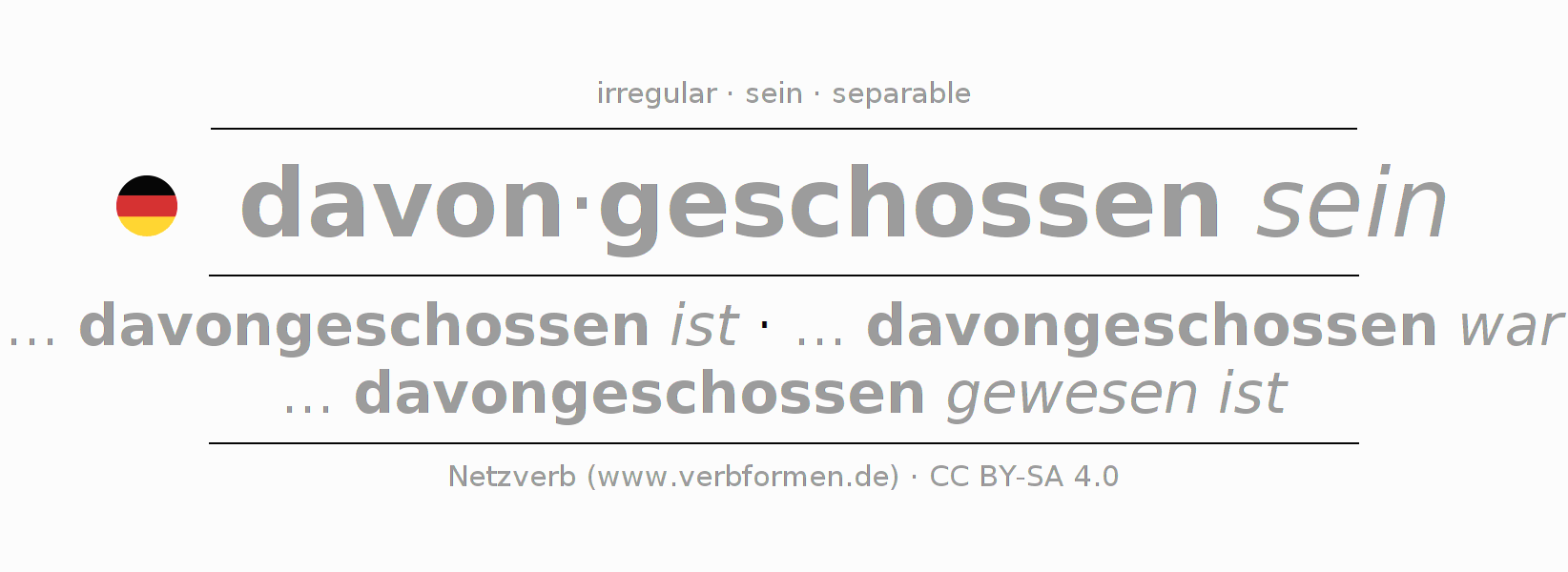 Tablas de verbos para la conjugación de davon·geschossen sein en línea, representadas de forma simple, con todas las construcciones verbales en singular y plural, en todas las personas gramaticales (1ª persona, 2ª persona, 3ª persona). El practicar la conjugación del verbo davon·geschossen sein es útil para tareas, exámenes, la escuela, la universidad, las clases de alemán y para los estudiantes adultos. Especialmente para los estudiantes del alemán es muy importante el conjugar los verbos y el formar las raíces verbales de forma correcta. Aquí encuentras más información acerca del tema Wiktionary davonschießen und unter davonschießen im Duden.