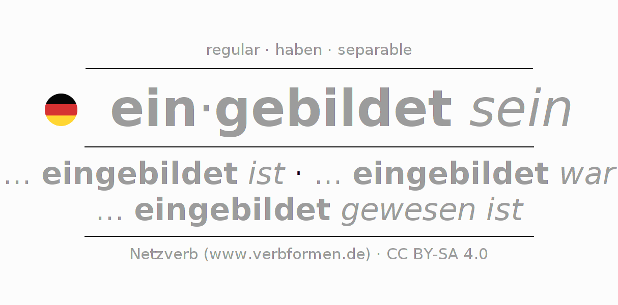 Tablas de verbos para la conjugación de ein·gebildet sein en línea, representadas de forma simple, con todas las construcciones verbales en singular y plural, en todas las personas gramaticales (1ª persona, 2ª persona, 3ª persona). El practicar la conjugación del verbo ein·gebildet sein es útil para tareas, exámenes, la escuela, la universidad, las clases de alemán y para los estudiantes adultos. Especialmente para los estudiantes del alemán es muy importante el conjugar los verbos y el formar las raíces verbales de forma correcta. Aquí encuentras más información acerca del tema Wiktionary einbilden und unter einbilden im Duden.