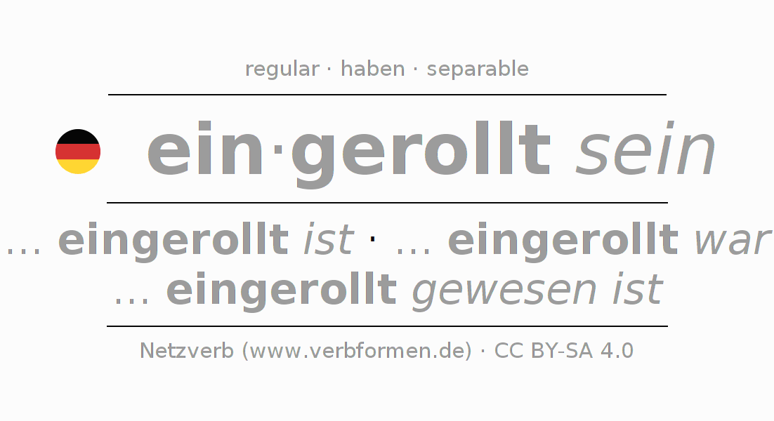 Tablas de verbos para la conjugación de ein·gerollt sein en línea, representadas de forma simple, con todas las construcciones verbales en singular y plural, en todas las personas gramaticales (1ª persona, 2ª persona, 3ª persona). El practicar la conjugación del verbo ein·gerollt sein es útil para tareas, exámenes, la escuela, la universidad, las clases de alemán y para los estudiantes adultos. Especialmente para los estudiantes del alemán es muy importante el conjugar los verbos y el formar las raíces verbales de forma correcta. Aquí encuentras más información acerca del tema Wiktionary einrollen und unter einrollen im Duden.