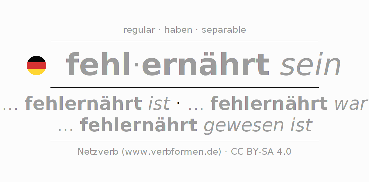 - Presente: ... ich fehlernährt bin, ... du fehlernährt bist, ... er fehlernährt ist, ... wir fehlernährt sind, ... ihr fehlernährt seid, ... sie fehlernährt sind