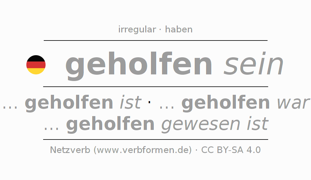 Tablas de verbos para la conjugación de geholfen sein en línea, representadas de forma simple, con todas las construcciones verbales en singular y plural, en todas las personas gramaticales (1ª persona, 2ª persona, 3ª persona). El practicar la conjugación del verbo geholfen sein es útil para tareas, exámenes, la escuela, la universidad, las clases de alemán y para los estudiantes adultos. Especialmente para los estudiantes del alemán es muy importante el conjugar los verbos y el formar las raíces verbales de forma correcta. Aquí encuentras más información acerca del tema Wiktionary helfen und unter helfen im Duden.