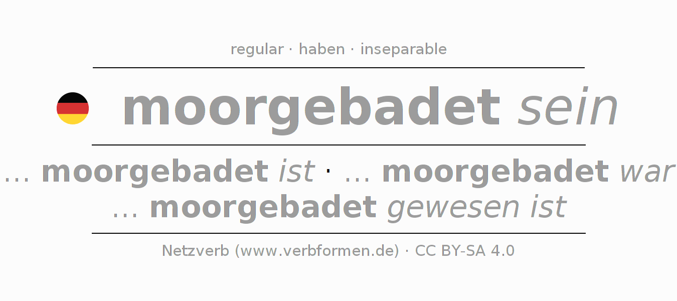 - Presente: sei (du) moorgebadet, seien wir moorgebadet, seid (ihr) moorgebadet, seien Sie moorgebadet