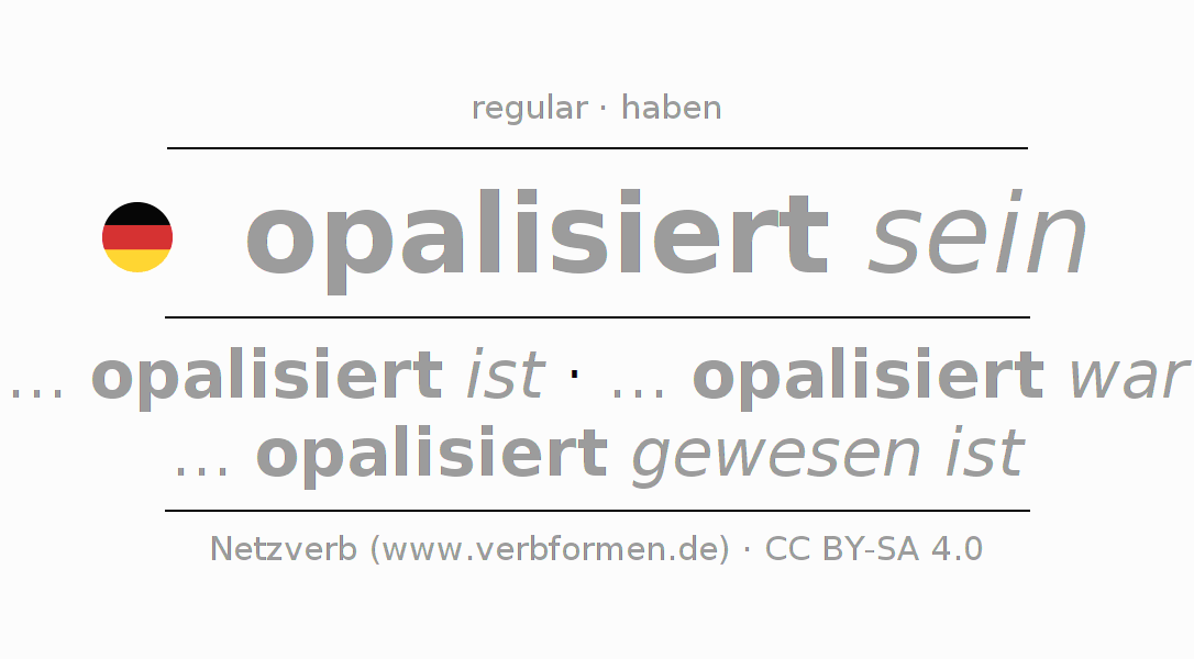 Tablas de verbos para la conjugación de opalisiert sein en línea, representadas de forma simple, con todas las construcciones verbales en singular y plural, en todas las personas gramaticales (1ª persona, 2ª persona, 3ª persona). El practicar la conjugación del verbo opalisiert sein es útil para tareas, exámenes, la escuela, la universidad, las clases de alemán y para los estudiantes adultos. Especialmente para los estudiantes del alemán es muy importante el conjugar los verbos y el formar las raíces verbales de forma correcta. Aquí encuentras más información acerca del tema Wiktionary opalisieren und unter opalisieren im Duden.