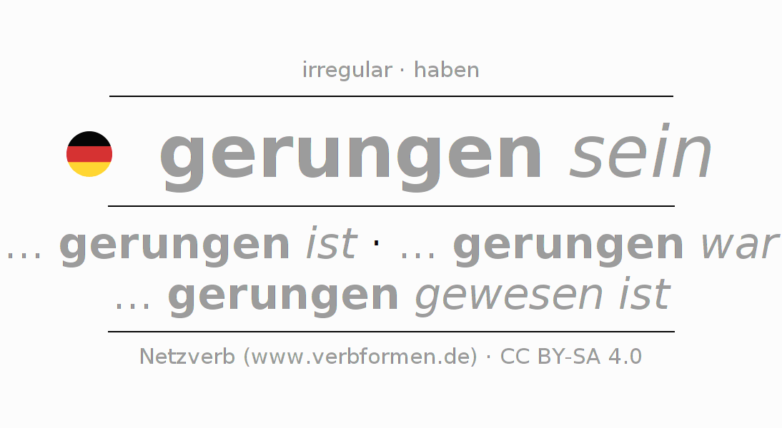 Tablas de verbos para la conjugación de gerungen sein en línea, representadas de forma simple, con todas las construcciones verbales en singular y plural, en todas las personas gramaticales (1ª persona, 2ª persona, 3ª persona). El practicar la conjugación del verbo gerungen sein es útil para tareas, exámenes, la escuela, la universidad, las clases de alemán y para los estudiantes adultos. Especialmente para los estudiantes del alemán es muy importante el conjugar los verbos y el formar las raíces verbales de forma correcta. Aquí encuentras más información acerca del tema Wiktionary ringen und unter ringen im Duden.