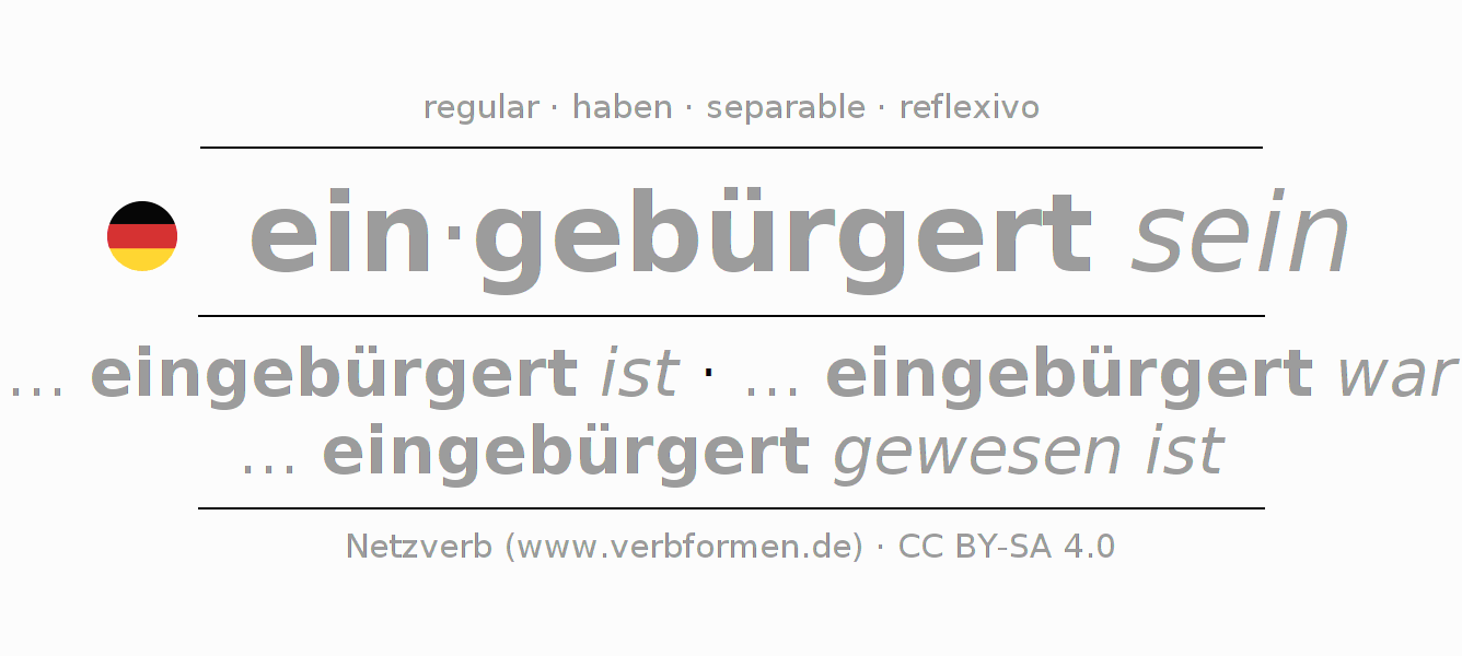 Tablas de verbos para la conjugación de ein·gebürgert sein en línea, representadas de forma simple, con todas las construcciones verbales en singular y plural, en todas las personas gramaticales (1ª persona, 2ª persona, 3ª persona). El practicar la conjugación del verbo ein·gebürgert sein es útil para tareas, exámenes, la escuela, la universidad, las clases de alemán y para los estudiantes adultos. Especialmente para los estudiantes del alemán es muy importante el conjugar los verbos y el formar las raíces verbales de forma correcta. Aquí encuentras más información acerca del tema Wiktionary einbürgern und unter einbürgern im Duden.