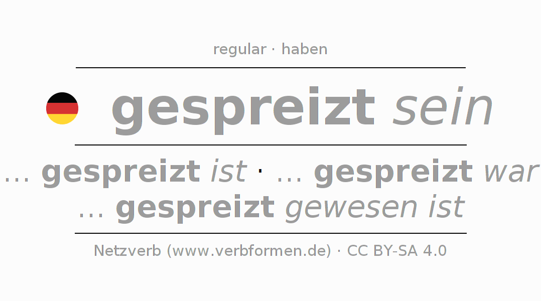 Tablas de verbos para la conjugación de gespreizt sein en línea, representadas de forma simple, con todas las construcciones verbales en singular y plural, en todas las personas gramaticales (1ª persona, 2ª persona, 3ª persona). El practicar la conjugación del verbo gespreizt sein es útil para tareas, exámenes, la escuela, la universidad, las clases de alemán y para los estudiantes adultos. Especialmente para los estudiantes del alemán es muy importante el conjugar los verbos y el formar las raíces verbales de forma correcta. Aquí encuentras más información acerca del tema Wiktionary spreizen und unter spreizen im Duden.