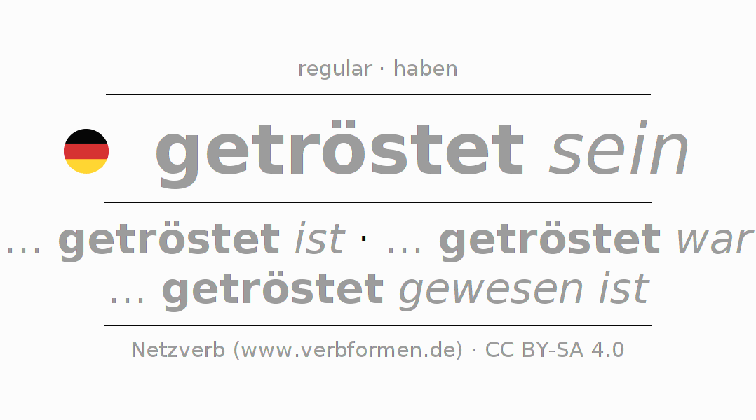 Tablas de verbos para la conjugación de getröstet sein en línea, representadas de forma simple, con todas las construcciones verbales en singular y plural, en todas las personas gramaticales (1ª persona, 2ª persona, 3ª persona). El practicar la conjugación del verbo getröstet sein es útil para tareas, exámenes, la escuela, la universidad, las clases de alemán y para los estudiantes adultos. Especialmente para los estudiantes del alemán es muy importante el conjugar los verbos y el formar las raíces verbales de forma correcta. Aquí encuentras más información acerca del tema Wiktionary trösten und unter trösten im Duden.