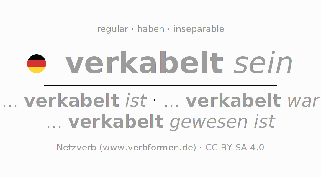 Tablas de verbos para la conjugación de verkabelt sein en línea, representadas de forma simple, con todas las construcciones verbales en singular y plural, en todas las personas gramaticales (1ª persona, 2ª persona, 3ª persona). El practicar la conjugación del verbo verkabelt sein es útil para tareas, exámenes, la escuela, la universidad, las clases de alemán y para los estudiantes adultos. Especialmente para los estudiantes del alemán es muy importante el conjugar los verbos y el formar las raíces verbales de forma correcta. Aquí encuentras más información acerca del tema Wiktionary verkabeln und unter verkabeln im Duden.